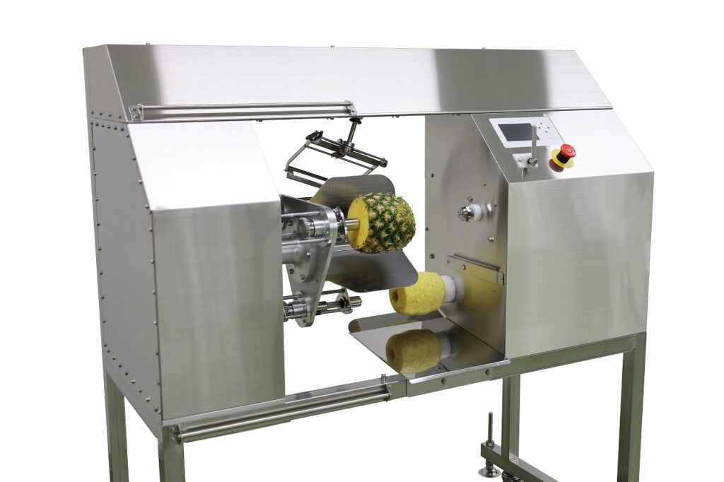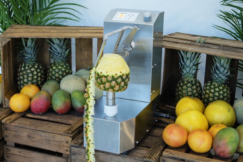 大きい果物向けの皮むき機で、パイナップルの歩留まりは60%以上!「芯抜き器」の取り付けで、誰でも簡単に最小限の労力で芯抜きも可能になります。