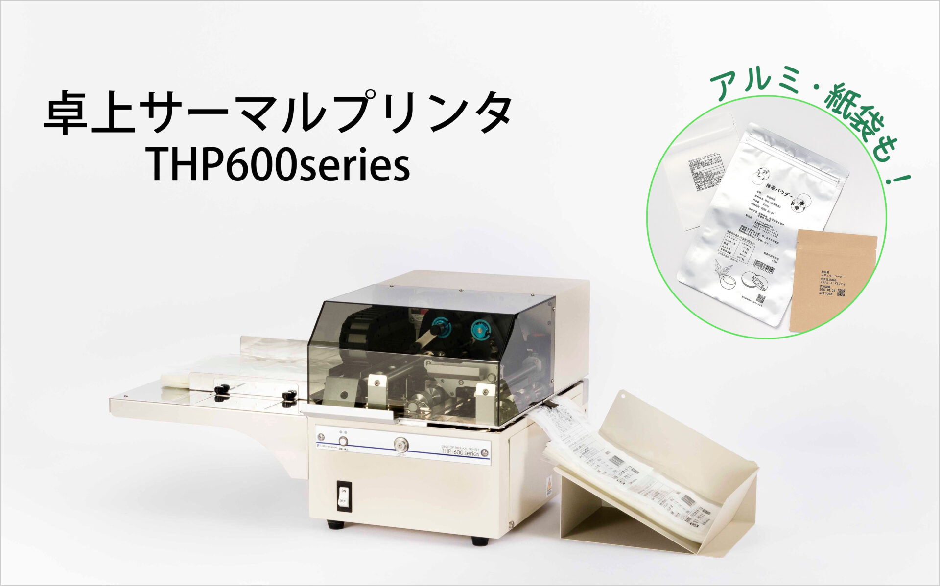 ●空袋に対して、オフラインで日付・ロット番号・⼀括表⽰などを直接印字、卓上サーマルプリンタ「THP600シリーズ」